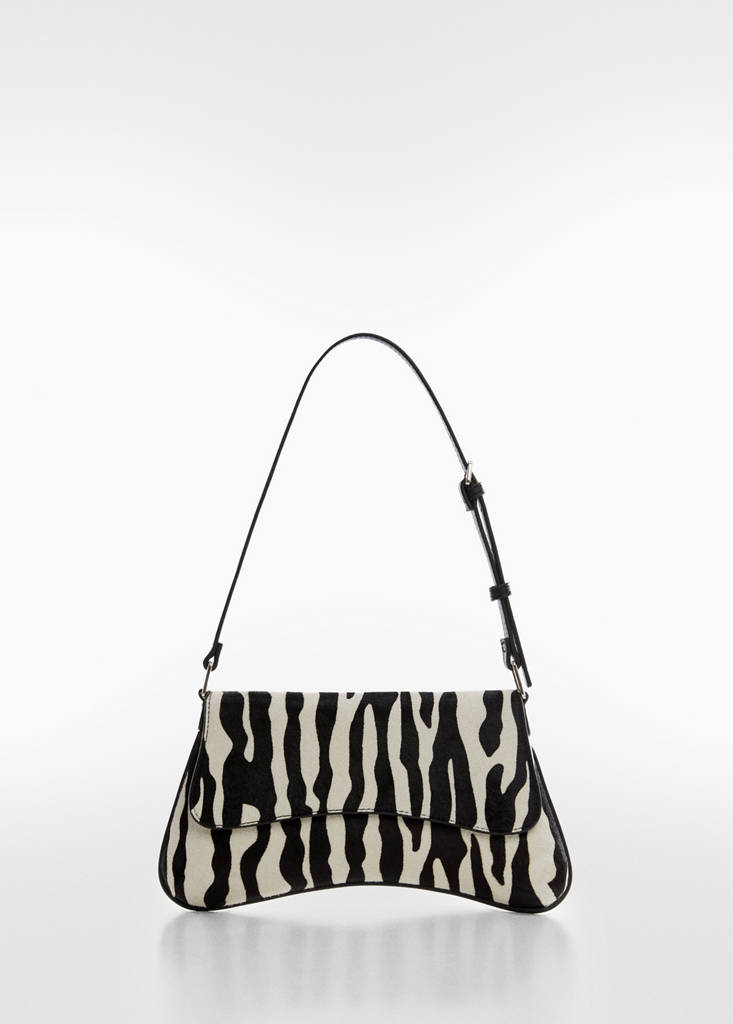 Leather-blend fabric, short chain strap, adjustable strap, flap closure with magnetic button, inner lining.