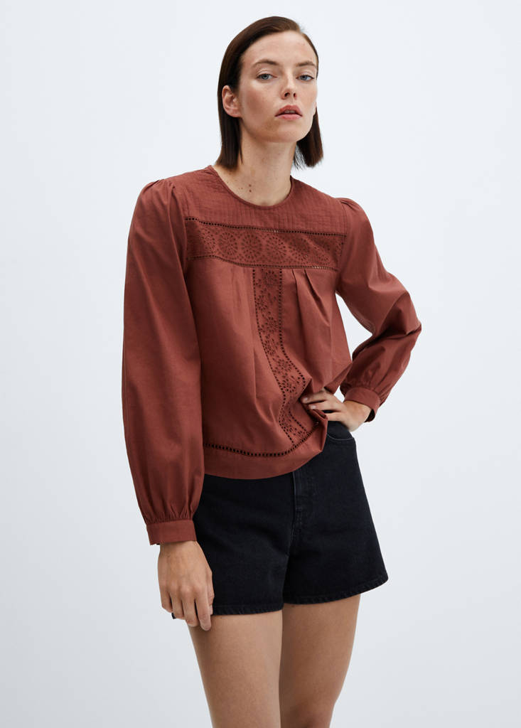 100% Cotton, oversize design, rounded neck, long sleeve with buttoned cuffs, button fastening at back, openwork details.