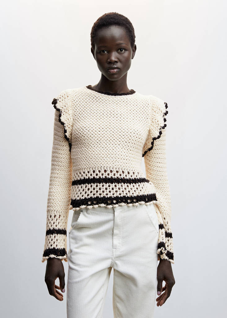 Medium knit. Straight design. Short design. Rounded neck. Long sleeve. Openwork details. Ruffles on the shoulders