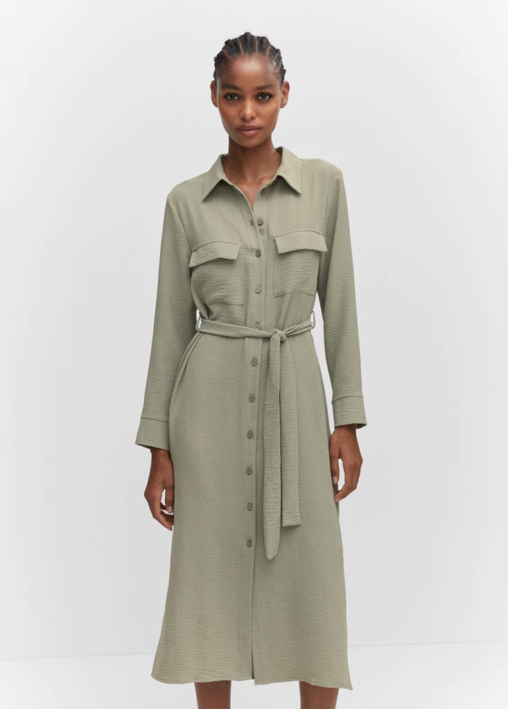 Flowy fabric, shirt-style, straight design, midi design, shirt-style collar, long sleeve, two front flap pockets, button fastening on the front section, side slits.
