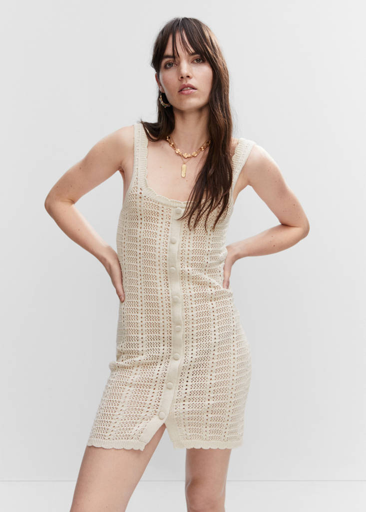 Thick knitted fabric. Openwork knit fabric. Straight design. Short design. Rounded neck. Wide straps. Button fastening on the front section. Scalloped edges
