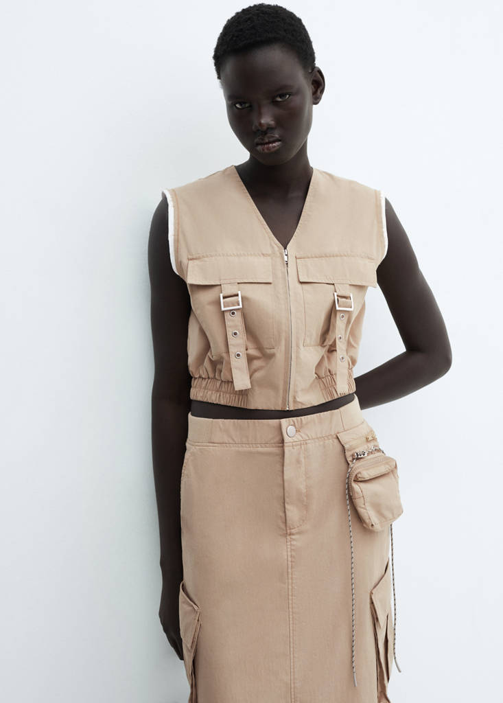 Cotton blend fabric. Cargo design. Short design. V-neck. Sleeveless. Two front flap pockets. Decorative buckles. Zip fastening on the front section. Contrasting trim finish. Hem with elastic band. Total look