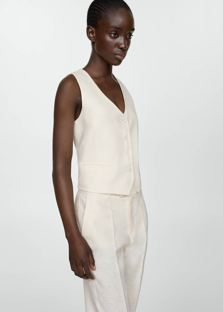 100% Linen. Straight design. V-neck. Sleeveless. Wide straps. Inner lining. Total look. Front closure with buttons. Two front welt pockets. Medium. Front closure. Lining only