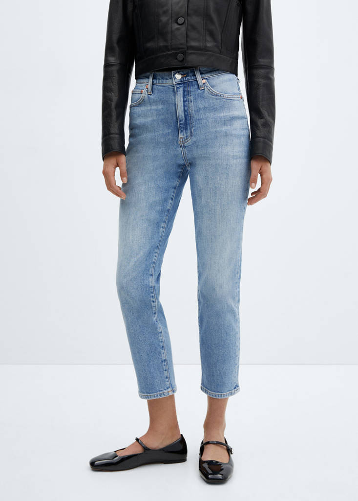 Denim-style cotton fabric. Stretch fabric. Crop design. Skinny fit. Mid-rise. Belt loops. Five pockets. Zip and button fastening. Inseam 68 cm. Slim fit. Medium. High waist. Available Plus
