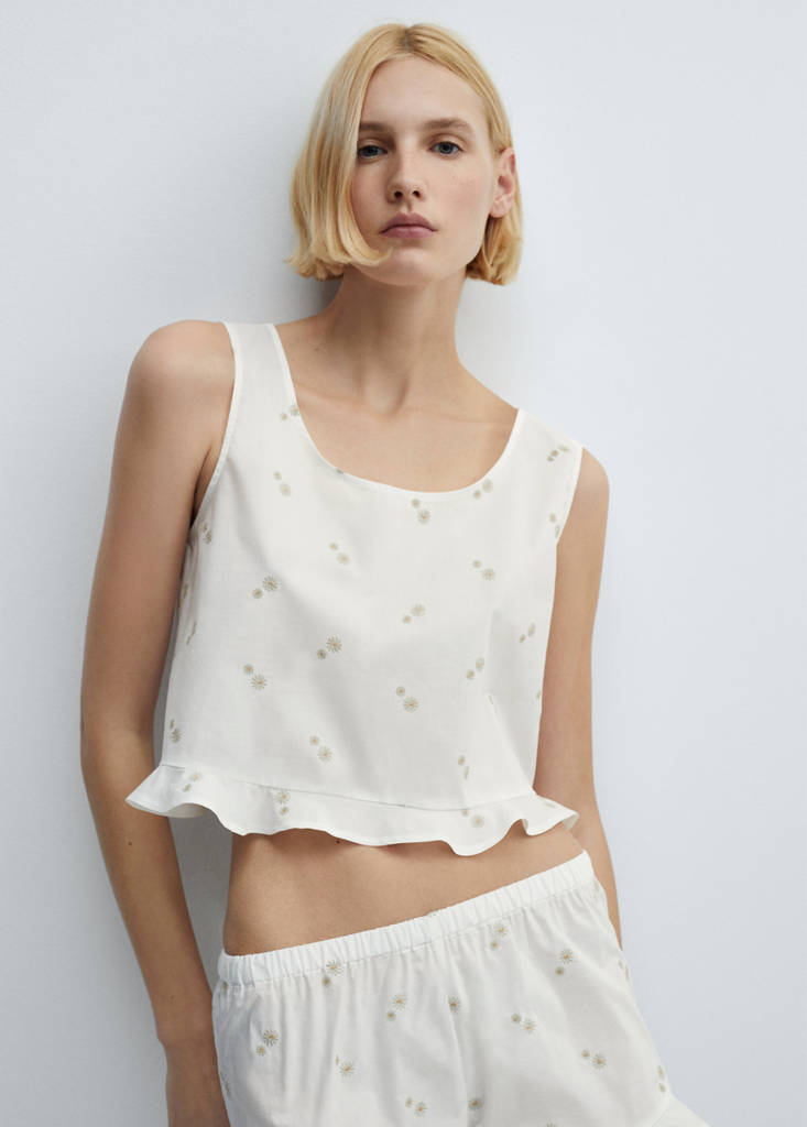 100% Cotton. Short design. Straight design. Flowered embroidery. Low neckline. Sleeveless. Wide straps. No Fastening. Total look