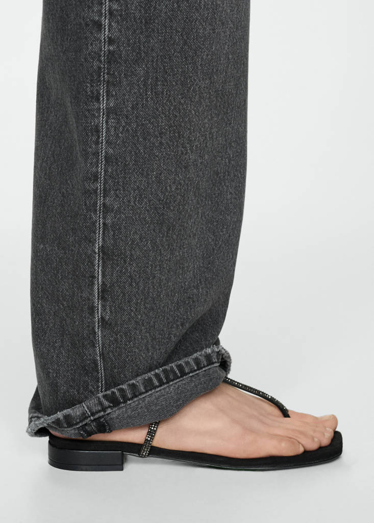 Flat. Square toed. Buckle closure. Rhinestone detail. Toe sandal