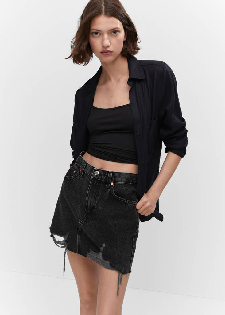 Denim-style cotton fabric. Straight design. Short design. Worn effect. Belt loops. Five pockets. Zip and button fastening. Frayed hem. Available Plus. The dark grey model is an online exclusive. Festival Season
