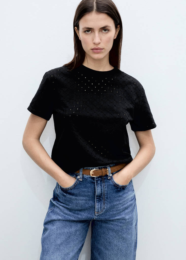 Embroidered openwork t-shirtPrice historyInitial price struck through [€ 22,99 ]€ 22,99Second price struck through [€ 15,99 ]€ 15,99Current price [€ 12,99 ]€ 12,99-43%Select a colourBlackSelect your sizeXXSLast few items!XSSMNot available. I want it!LNot available. I want it!XLNot available. I want it!XXLNot available. I want it!1XLNot available. I want it!2XLNot available. I want it!3XLNot available. I want it!MeasurementsAdd100% cotton fabric. Openwork design. Embroidered design. Round neck. Short sleevesDetails, composition and careStore availability