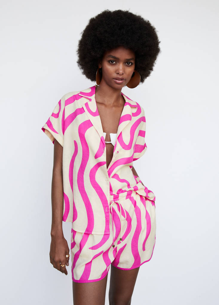Linen mix. Straight design. Short design. Side pockets. Elasticated waistband. Tie fastening. Total look. Printed design