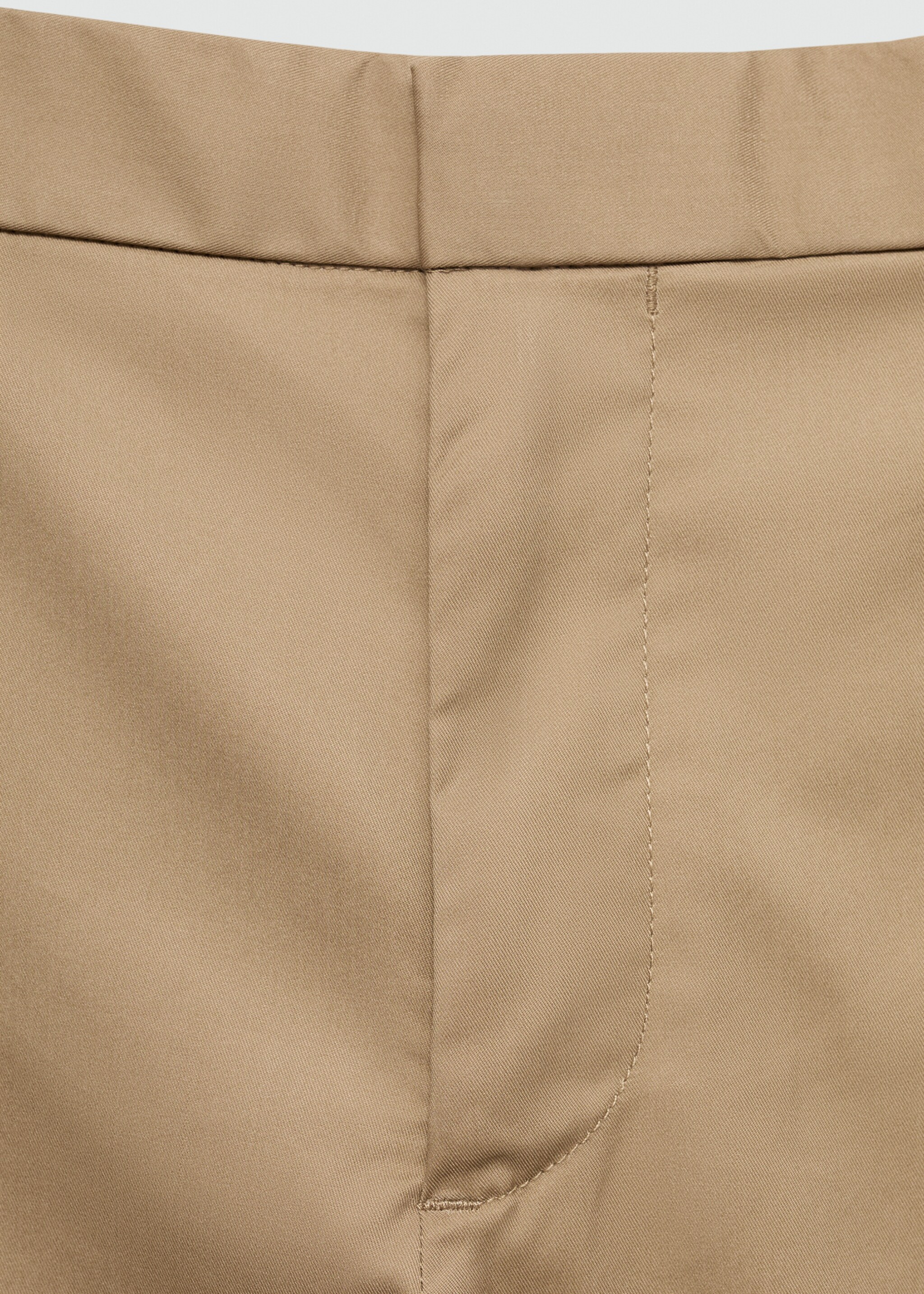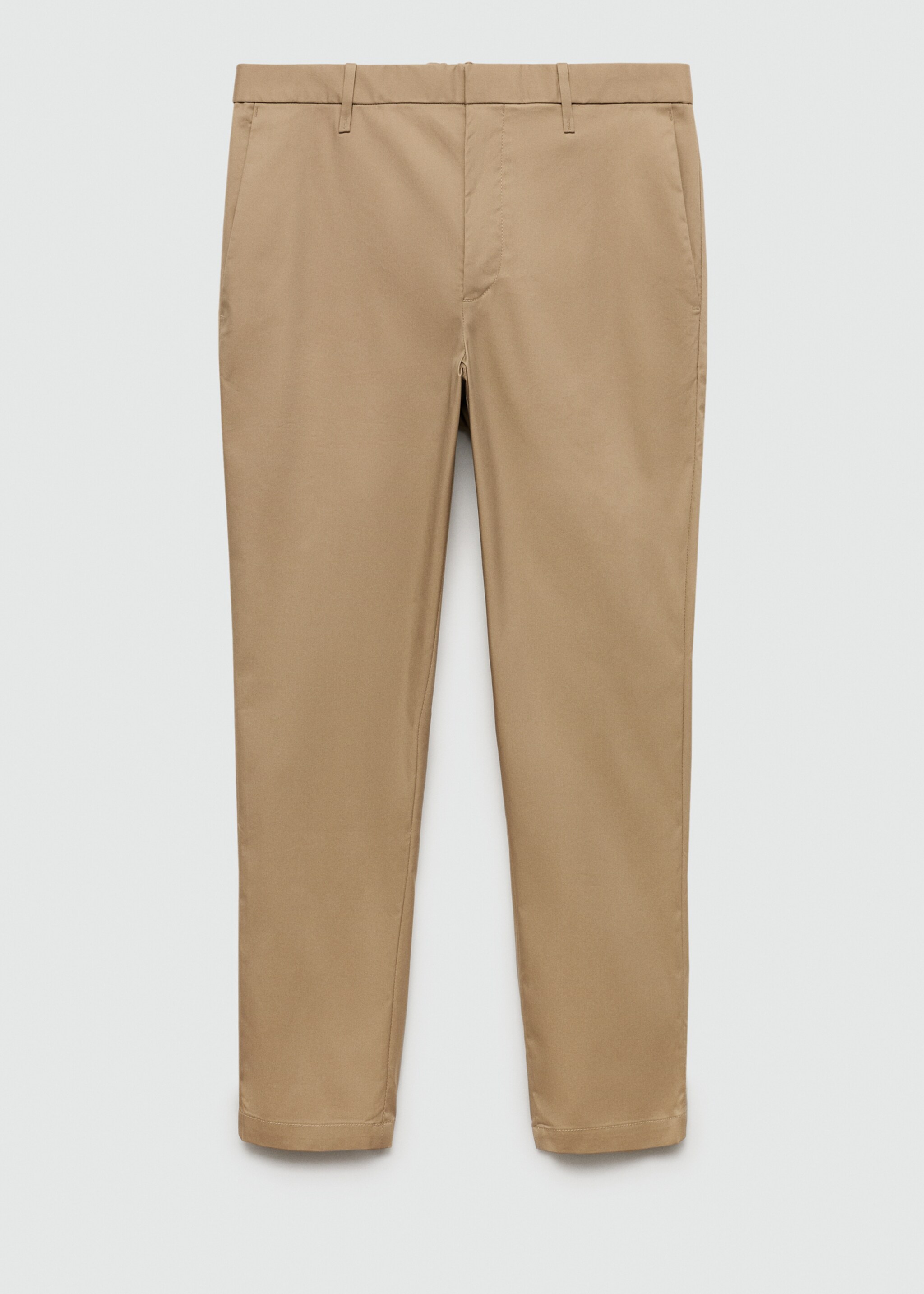 Update your closet with Mango Outlet's selection of cheap men's chino pants. This collection brings together everything from classic slim fit chinos to regular fit and tapered chinos, made in fabrics such as cotton twill or lightweight blends, designed to offer comfort and style at any time of the year. Men's regular fit pants are a versatile option for those looking for a comfortable and modern fit, ideal for everyday wear. Chino pants stand out for their versatility: you can find them in neutral tones like navy blue, beige or gray, as well as in trendy colors like khaki green or camel brown, ideal to combine with cheap shirts, men's polo shirts or cheap sweaters. The different cuts allow to adapt to every occasion. The slim fit pants models stylize the silhouette and are perfect for urban looks or for a casual date, while the cheap chino pants designs with darts provide a more sophisticated touch, ideal for the office or events that require extra elegance without losing comfort. If you are looking for a relaxed style, tapered chino pants with elastic waist and crop details are the best choice for the weekend or for traveling comfortably without sacrificing design. Among the benefits of choosing this type of pants is their ability to adapt to any plan, from business meetings to dinners with friends. If you are looking for a more elegant garment, Mango Outlet's men's dress pants offer a perfect alternative for formal occasions without sacrificing comfort. Discover the collection of men's chino pants and bet on an essential, comfortable and always fashionable garment. If you are looking for men's pants, Mango Outlet is your ideal destination to renew your closet with the latest trends at competitive prices.