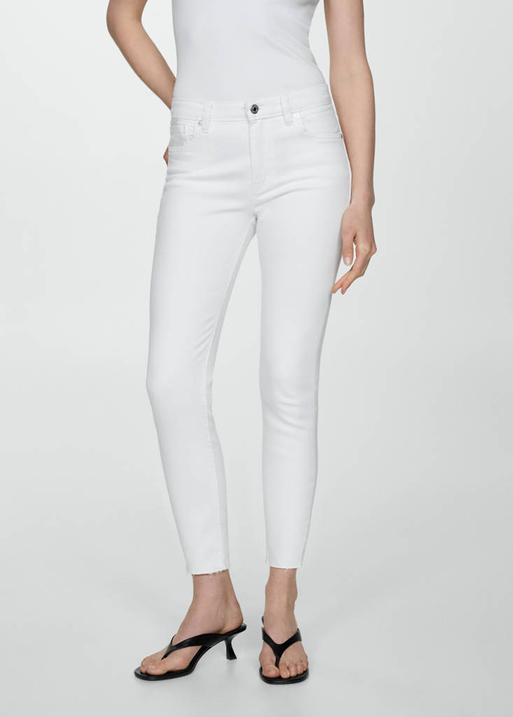 Denim-style cotton fabric. Stretch fabric. Skinny fit. Crop design. Mid-rise. Belt loops. Five pockets. Zip and button closure. Frayed finish. Inseam 26.77 in