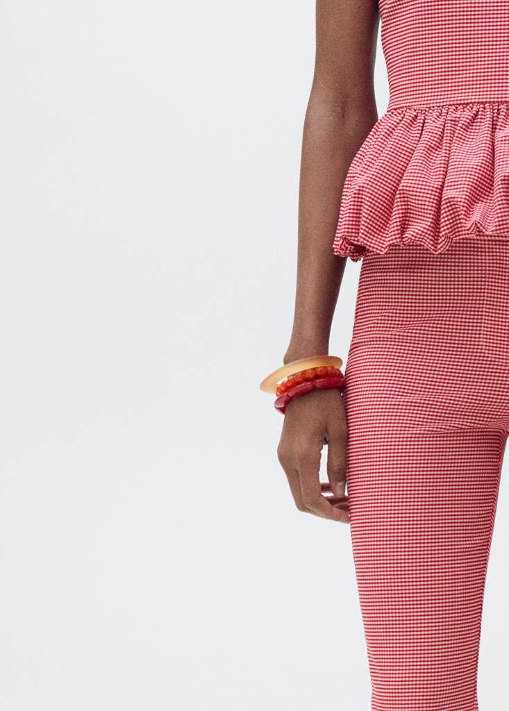 Straight design. Crop design. Gingham check print. High-rise. Concealed button, hook and zipper front closure with placket. Total look