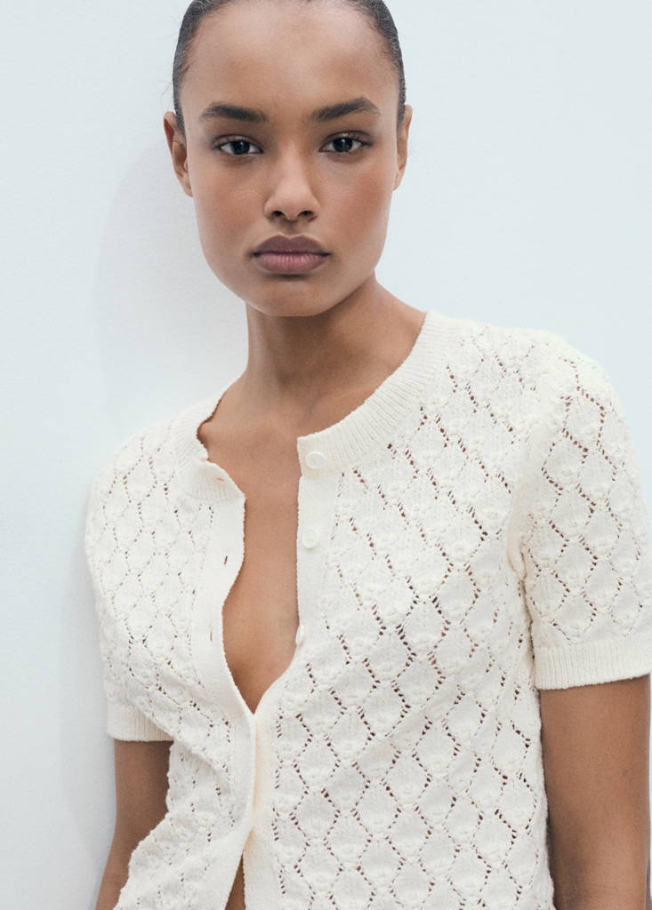 Openwork knit. Crochet design. Straight design. Round neck. Short sleeves. Front button closure. Total look. Available Plus
