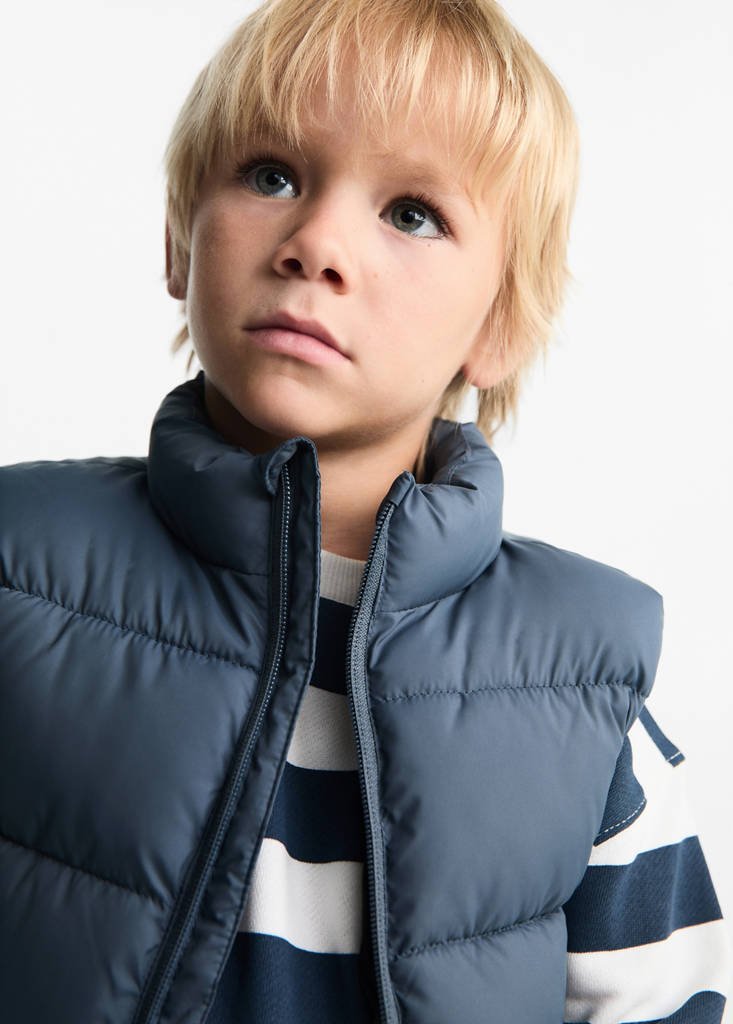 Quilted design. Straight design. High neck. Sleeveless. Two side pockets. Zipper closure