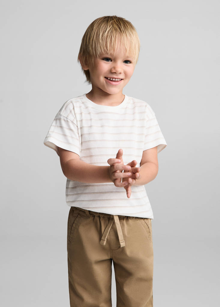 Fabric with cotton. Straight design. Elastic waistband. Adjustable drawstring. Jeans with tie closure. Long design. Adjustable drawstring closure
