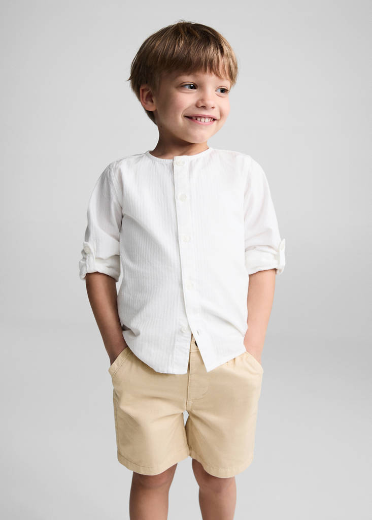 100% cotton. Short design. Straight design. Two pockets with flaps. Elastic waistband. Two welt pockets at the back. Button closure