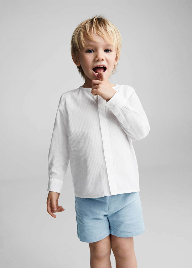Party, ceremony, and communion collection. Cotton and linen blend fabric. Mid-rise. Belt loops. Short design. Straight design. Button closure