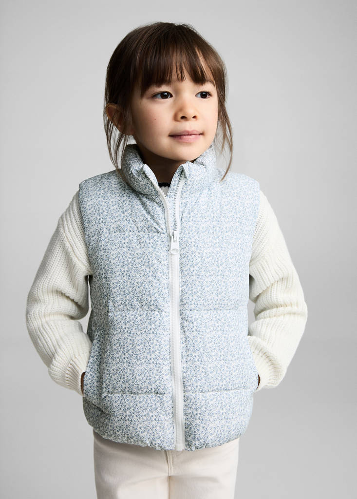 Quilted design. Floral print. Two front pockets. Label for personal data. High neck. Sleeveless. Front zipper closure
