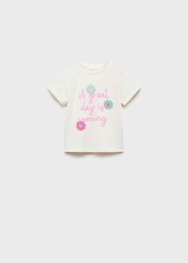 100% Cotton. Straight design. Message printed on the front. Embroidery on the front. Round neck with ribbed finish. Short sleeves