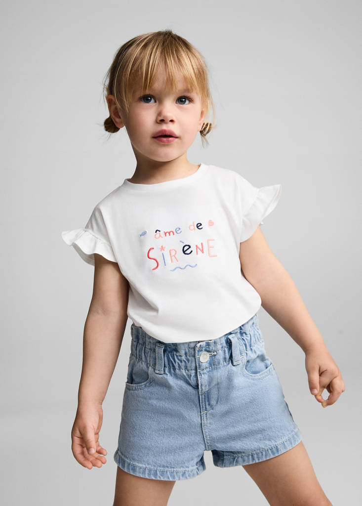 Denim-style cotton fabric. Elastic paper bag waistband. Short design. Five pockets. Paperbag. Belt loops. One press stud fastening