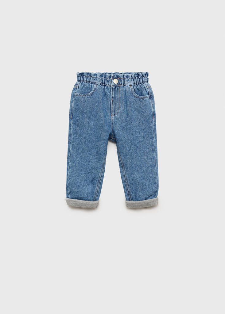 Regular fit. Long design. Paperbag. Jeans with tie closure. Rolled-up hem. One press stud fastening. Denim-style cotton fabric. Elastic waistband