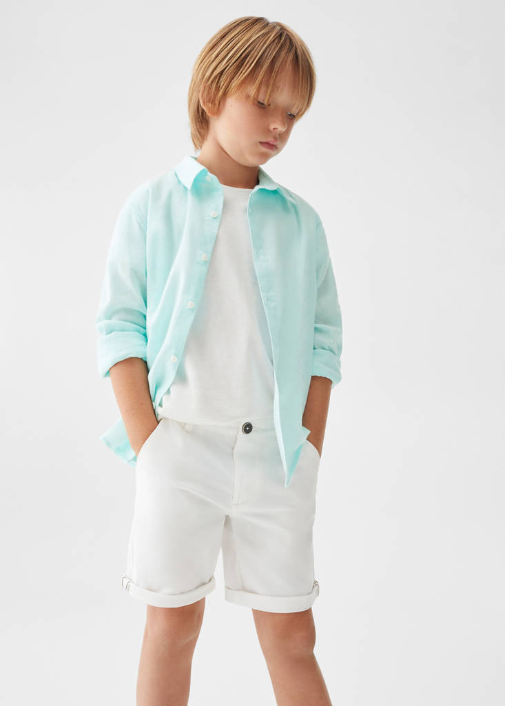 100% Cotton. Short design. Mid-rise. Belt loops. Two side pockets. Two welt pockets at the back. Zip and button closure. Party, ceremony, and communion collection. Fabric with cotton. Chinos style