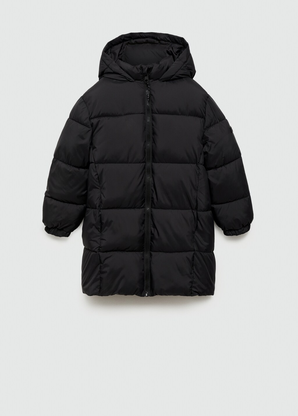 Quilted design. Straight design. Long design. Faux shearling interior. Turtleneck. Long sleeves. Hood. Label for personal data. Zip fastening.