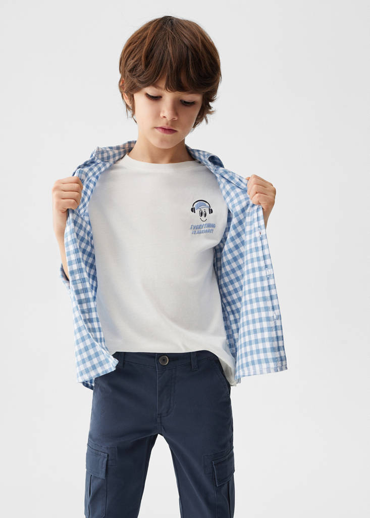 Cotton fabric. Mid-rise. Regular fit. Cargo design. Two side pockets. Two cargo pockets. Belt loops. Back patch pocket. Zip and button closure