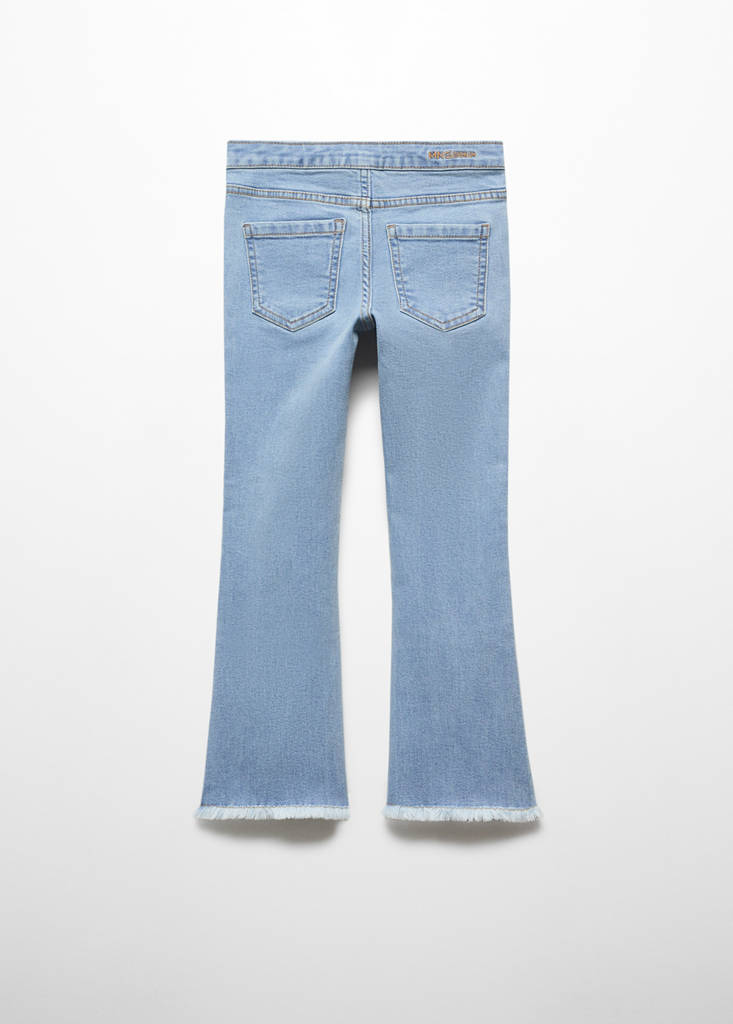 Denim-style cotton fabric. Straight design. Long design. Flare design. Mid-rise. Jeans with tie closure. Frayed hem. Zip and button closure. Back to school. Belt loops. Five pockets. High-rise. Denim fabric
