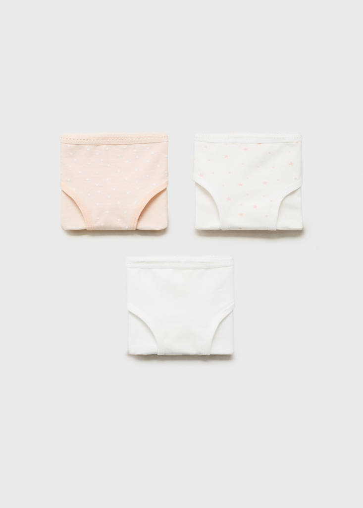Pack of 3. Fabric with cotton. Classic design. Polka dot print. Star print. Elastic waistband. Elastic finish. Cotton fabric. Classic panty