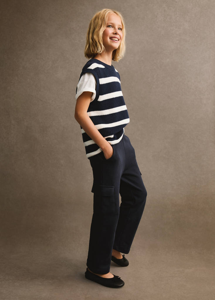 Back to school collection. 100% cotton. Straight design. Long design. Two cargo pockets. Two side pockets. Elastic waistband. No closure. Cargo design
