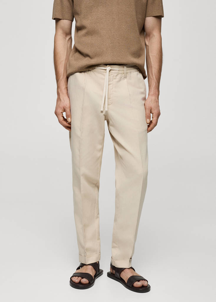 Set available as total look. Slim fit. Cotton and linen blend fabric. Elastic waistband with adjustable drawstring. Belt loops. Two front pockets. Front pleat detail. Two welt pockets with button at the back. Turn-up hem. Front zipper and button closure. Pressed crease detail on the front and back