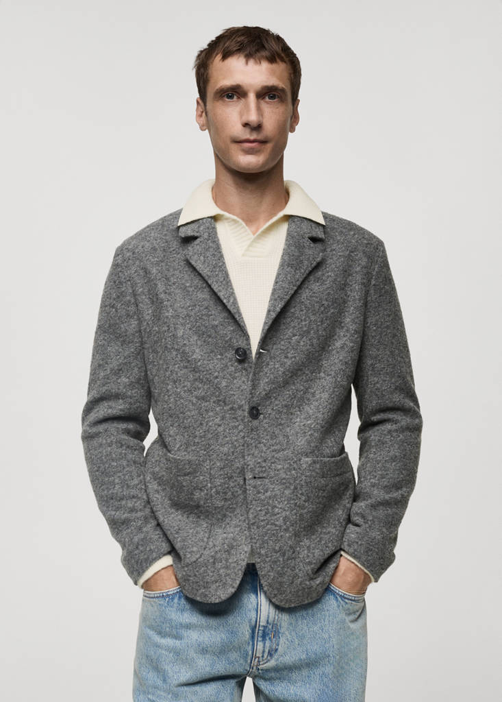 Wool mix fabric. Flecked design. Notched lapel collar. Button closure. Slim fit. Straight hem. Recycled materials. Two side patch pockets. Inner lining on sleeves. Hem with two side slits
