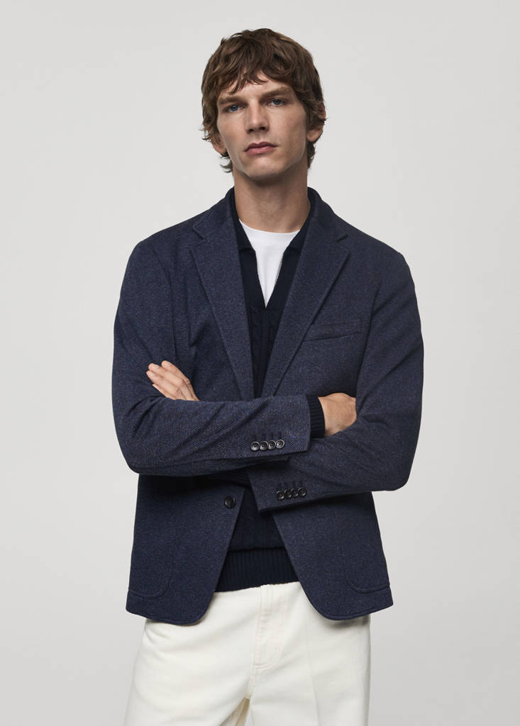 Cotton fabric. Herringbone pattern. Notched lapel collar. Two-button closure at the front. Two patch pockets on the front. Unlined. Two welt and button pockets on the inside. Double back vent at the hem. Slim fit. Long sleeves with buttoned cuffs