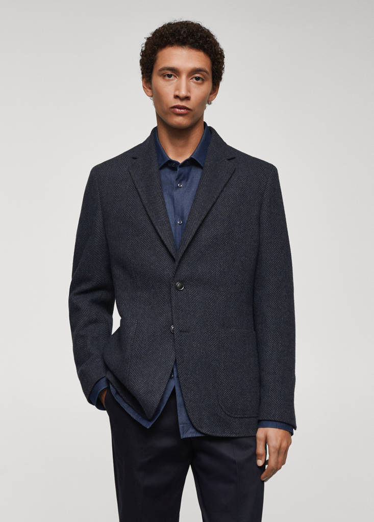 Slim fit. Recycled wool and polyester blend fabric. Notched lapel collar. Patch pocket on the front. Long sleeves. Straight hem. Partial lining. Interior pocket. Front button closure. Herringbone fabric