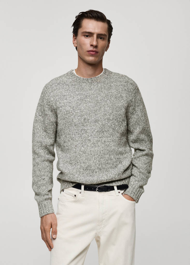 Round neck. Chunky knit fabric. Cotton and wool mix. Flecked design. Cable knit design