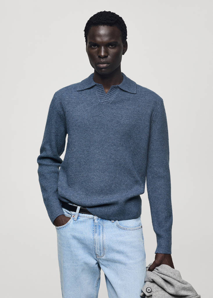 Regular fit. Midpoint. Quadrille structure. Recycled materials. Long sleeves. Polo collar. Untrimmed hem. The anthracite gray model is an online exclusive