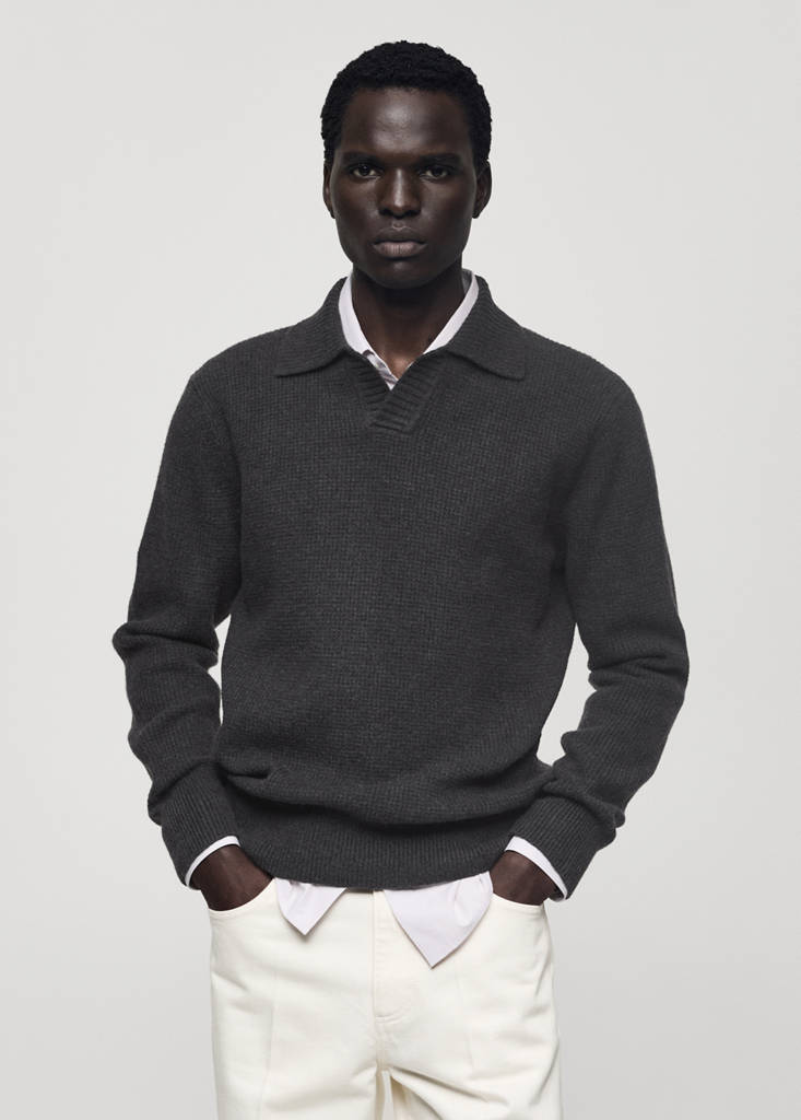 Regular fit. Midpoint. Quadrille structure. Recycled materials. Long sleeves. Polo collar. Untrimmed hem. The anthracite gray model is an online exclusive
