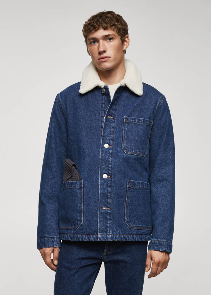 Denim-style cotton fabric. Faux shearling collar. Front closure with metal buttons. Patch pocket on the chest. Two patch pockets on the front. Long sleeves. Faux shearling interior. Interior pocket. Straight hem. 100% cotton fabric