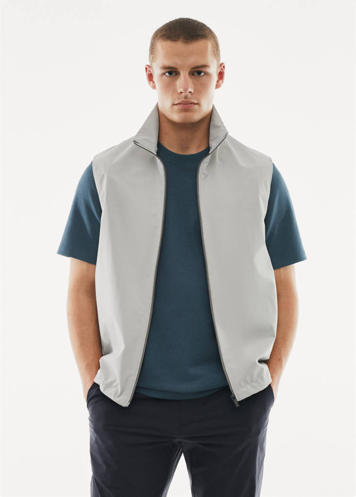 Performance Collection. Straight design. Regular fit. Lightweight fabric. Waterproof fabric. Easy-care fabric. Funnel neck with zip fastening. Front zipper closure. Two front pockets with invisible zipper. Waist with adjustable inner drawstring. Straight hem. Sleeveless. Fine inner lining. Inner zipped pocket. Water-repellent: The durable finish of this garment protects against light rain, repelling contact with water and raindrops. Windproof: This durable material offers protection against the wind for greater comfort in outdoor lifestyle