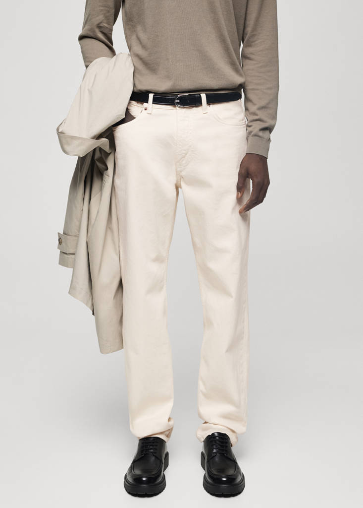 Regular fit. Long design. Mid-rise. Cotton fabric. Belt loops. Coin pocket. Two front pockets. Two patch pockets at the back. Zip and button closure. The pants measure 113 cm for the base size 42: 7 cm more than usual
