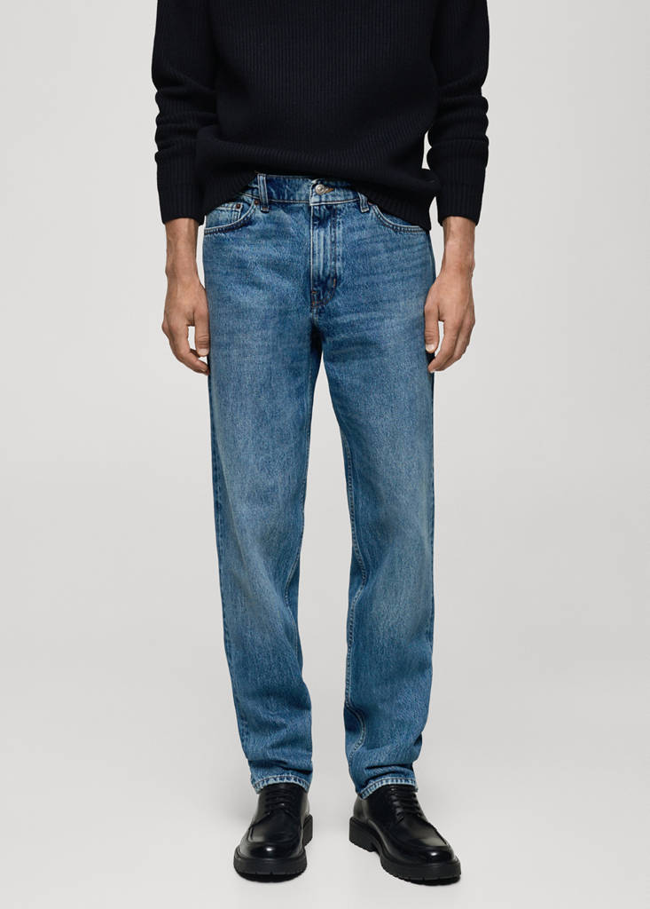 Medium wash. Mid-rise. Belt loops. Zip and button closure. Two front pockets. Coin pocket. Two patch pockets at the back. The pants measure 113 cm for the base size 42: 7 cm more than usual. Long design. Cotton fabric. Regular fit