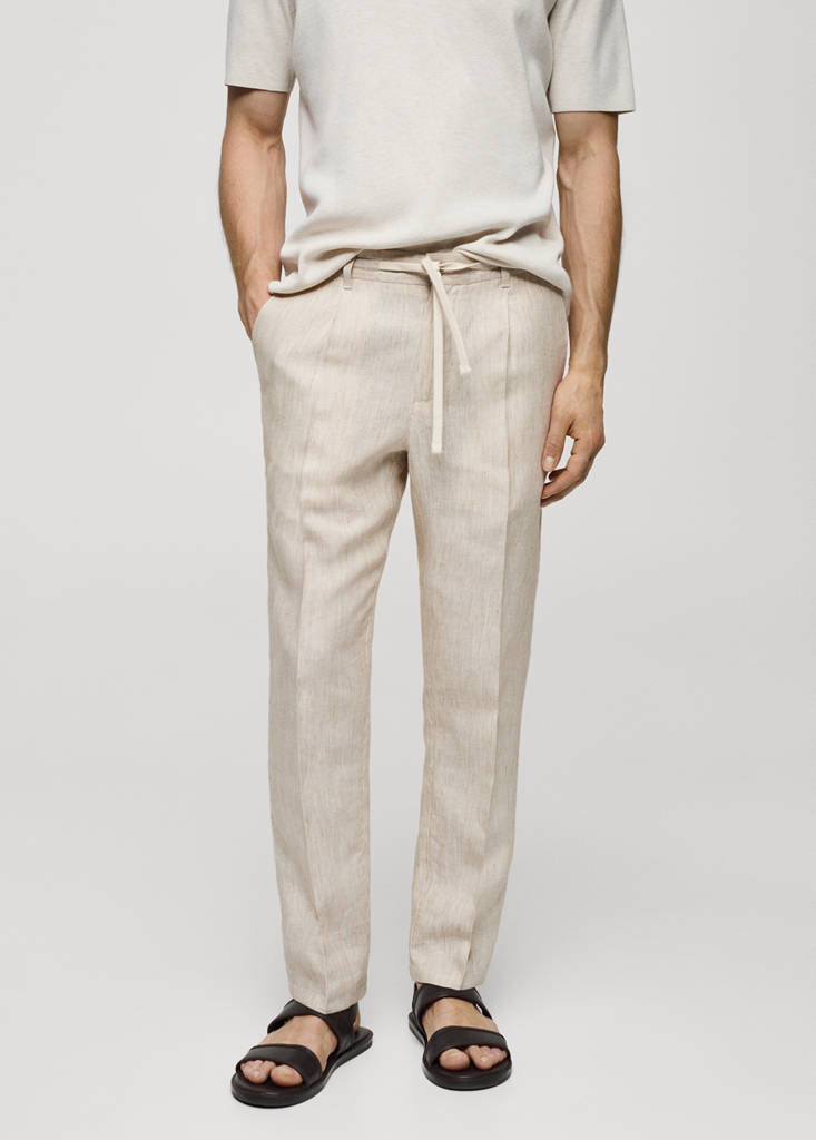 Slim fit. 100% linen fabric. Vertical striped print. Belt loops. Double-breasted button and zipper front closure. Elastic waistband with adjustable drawstring. Front pleat detail. Two front pockets. Two welt pockets with button at the back. Pressed crease detail on the front and back