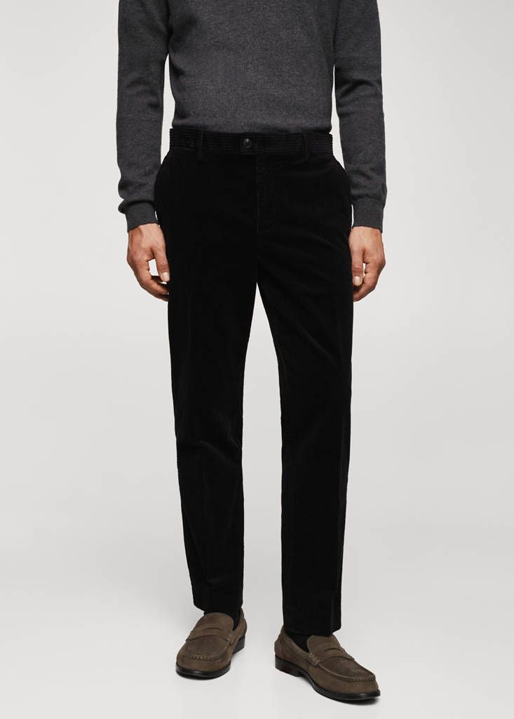 Slim fit. Cotton fabric. Corduroy fabric. Zip and button closure. Belt loops. Two front pockets. Two pockets with button on the back. Pressed crease detail on the front and back