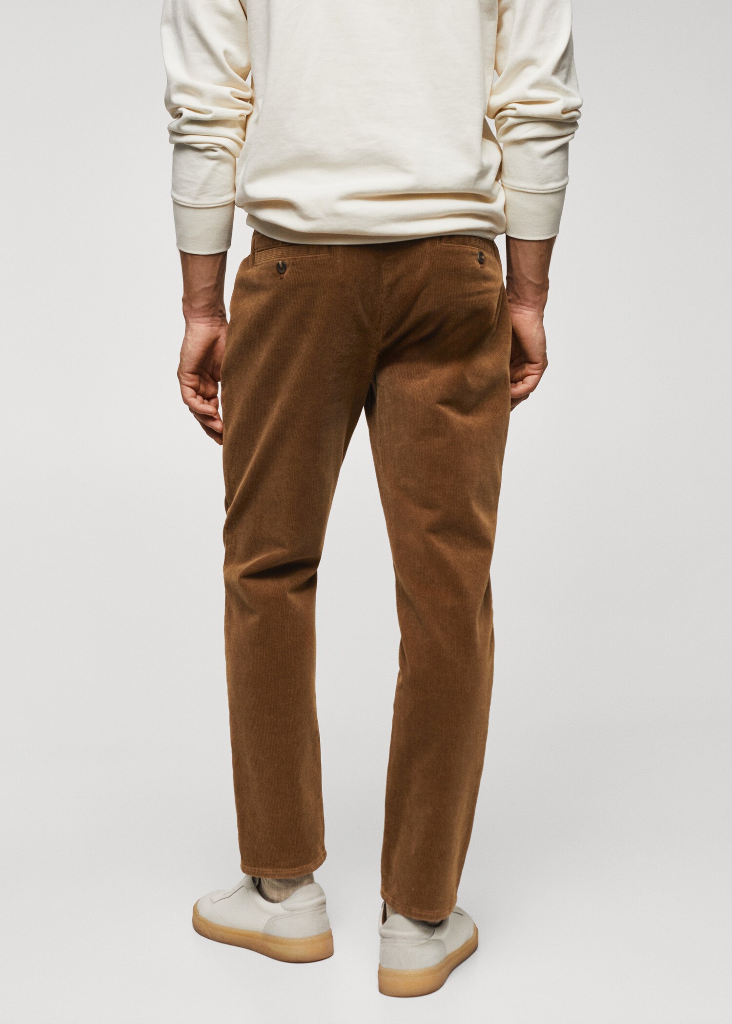 Slim fit. Cotton blend fabric. Micro corduroy. Crop design. Zip and button closure. Belt loops. Waist with adjustable inner drawstring. Two front pockets. Two welt pockets with button at the back. The model is 190 cm tall and wears a size 42. Adds a natural and elegant touch to any space with its versatile and functional design. Perfect for keeping your home stylishly organized.