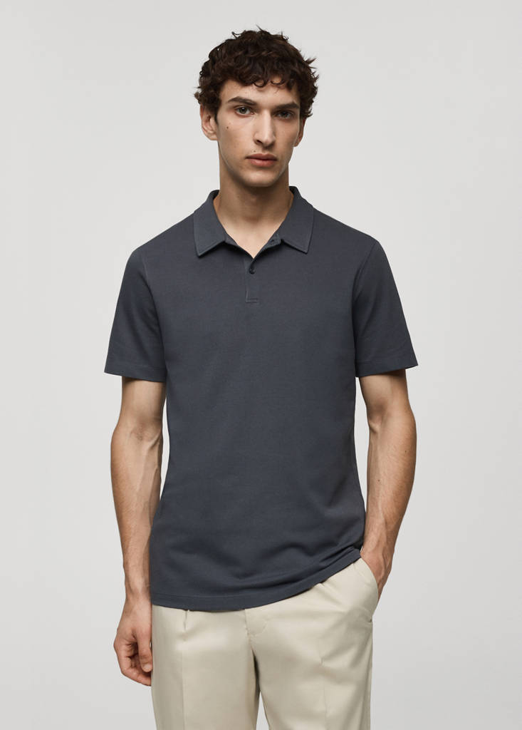 Khaki is an online exclusive. Slim fit. Cotton piquet fabric. Polo collar. Button closure at the neck. Short sleeves. Straight hem. The color brown is exclusive online. ESSENTIALS: Made to last. Cotton blend fabric