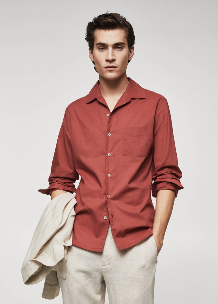 100% Cotton. Regular fit. Light fabric. Bowling collar. Front button closure. Patch pocket on the chest. Long sleeve with buttoned cuffs. Straight hem. Hem with side slits