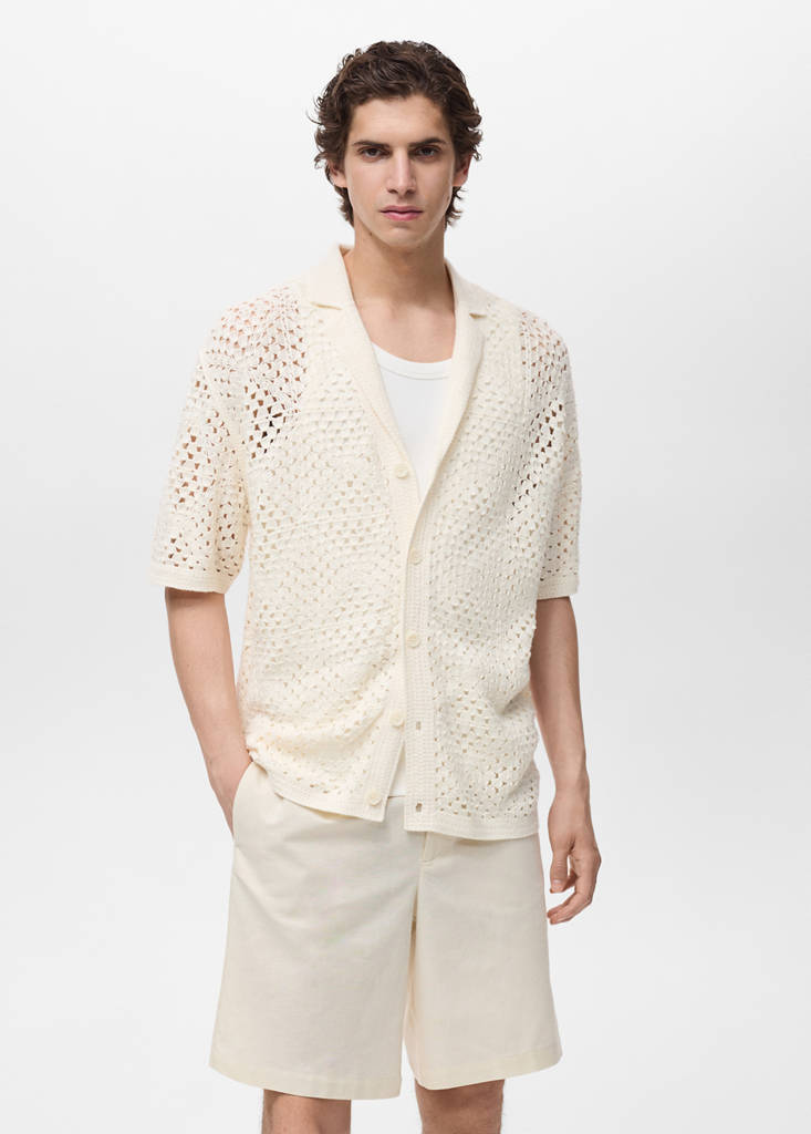 Straight fit. Cotton blend fabric. Crochet fabric. Short sleeves. Front button closure. Ribbed finish on neckline, sleeves, and hem