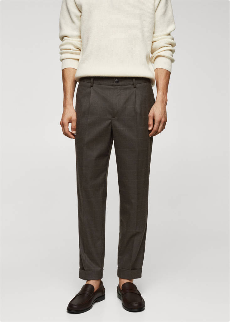 Slim fit. Window frame print. Zip and button closure. Front pleat detail. Two front pockets. Two welt pockets at the back. Turn-up hem. Pressed crease detail on the front and back