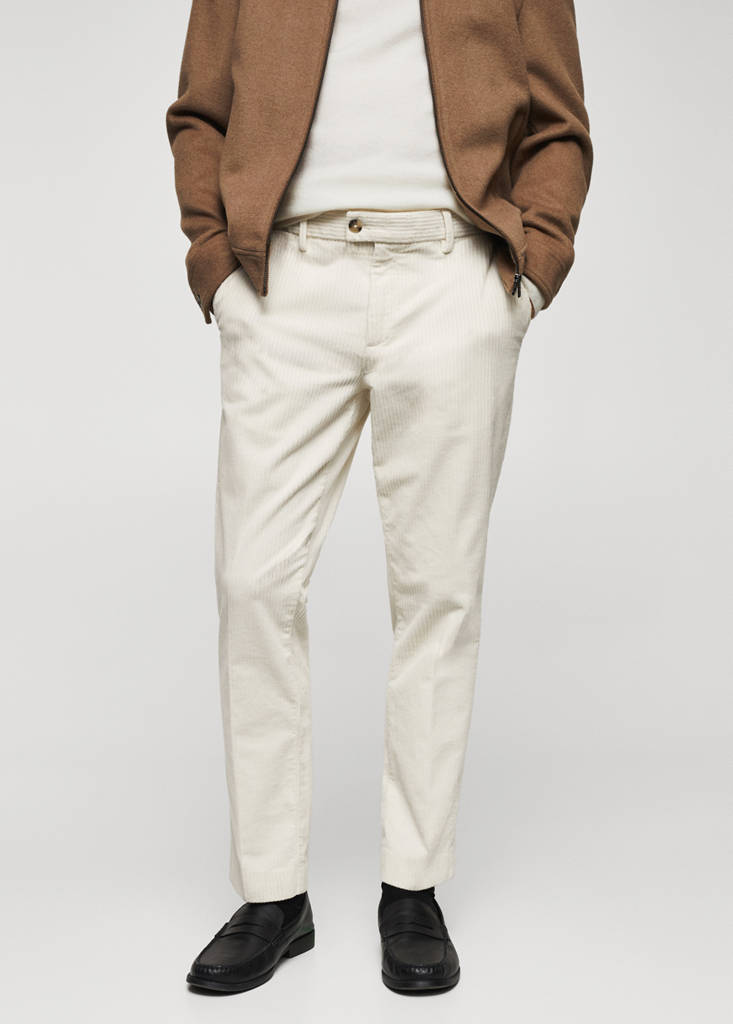 Slim fit. Cotton fabric. Corduroy fabric. Zip and button closure. Belt loops. Two front pockets. Two pockets with button on the back. Pressed crease detail on the front and back